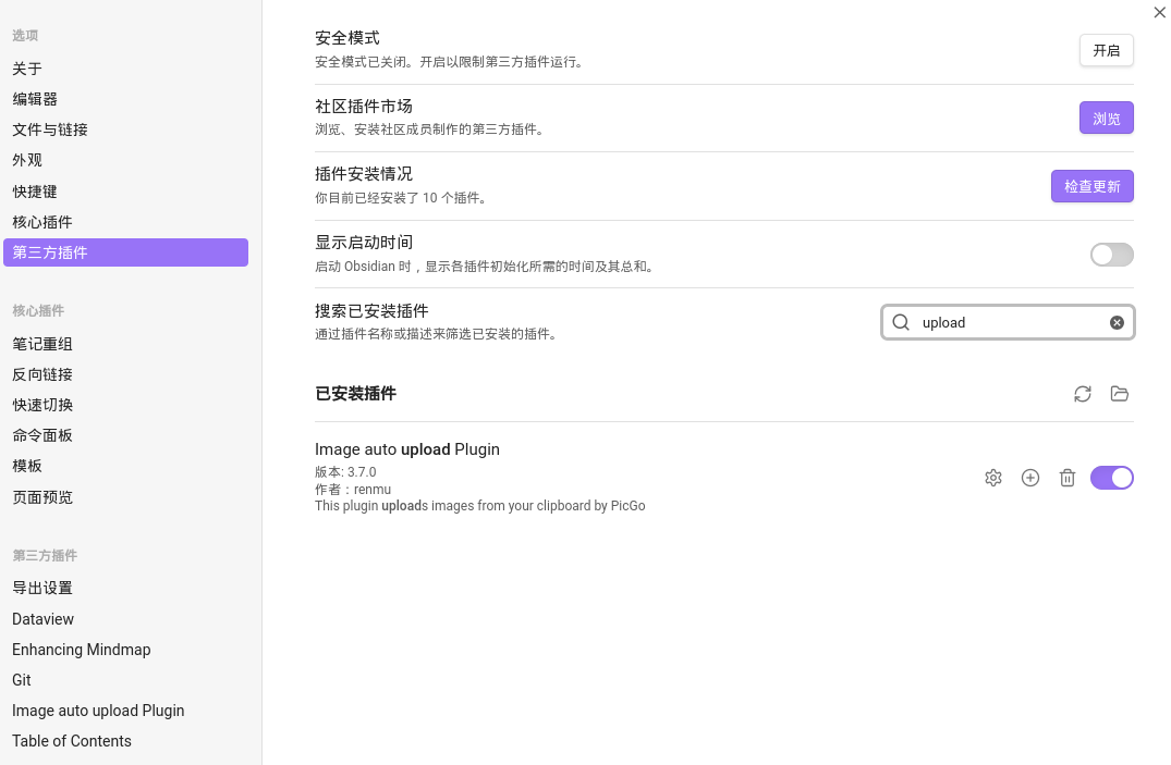 - 关闭安全模式,在社区插件市场中搜索"Image auto upload Plugin"并安装。