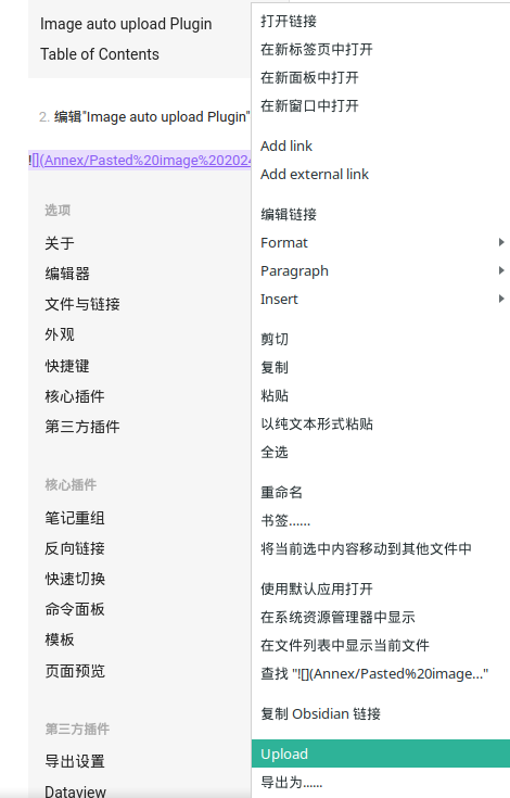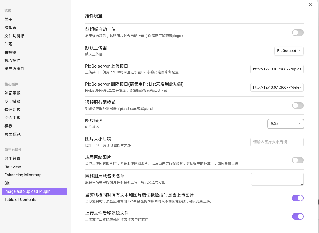 - 编辑"Image auto upload Plugin"插件配置,将默认上传器修改为"PicGo(app)"